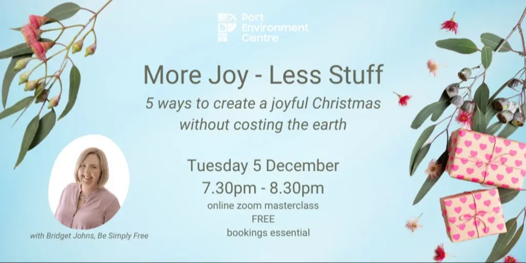 🎄 COST – Port Environment Centre offers you this FREE workshop. You’ll get the live masterclass including Q&A time, a copy of the recording to watch again, the Chaos Free Christmas workbook and clutter free gift ideas.